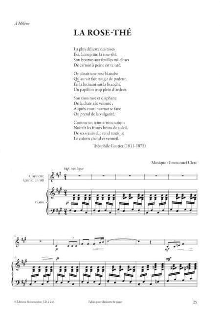 Quatre textes mis en musique pour clarinette et piano : une évocation du grillon qui vit caché et heureux, du chat qui sert en voulant nuire, de la montagne qui accouche d'une souris, et enfin de la rose-thé, la plus délicate de toutes !