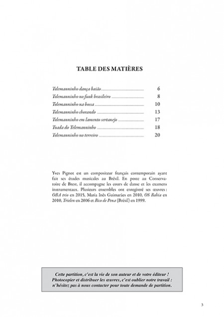 Telemanninho : cette suite a été conçue après lecture des 36 fantaisies pour clavecin de Georg Philipp Telemann. En effet, suivant une habitude, ou manie, ou plutôt une bonne manière de s’amuser des musiciens de choro brésiliens, cette envie d’adapter certains thèmes de musique classique est devenue évidente en mon esprit.