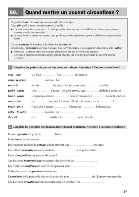 Cet ouvrages Exercices complète celui sur les Règles. Chaque fiche d'exercices fait référence au même numéro de la fiche Règles. Les règles d'orthographe nécessaires sont résumées dans chaque fiche Exercices, mais elles ne sont pas toujours complètes. Il convient donc, si l'on veut approfondir le travail, d'étudier la totalité de la fiche Règles avant de réaliser les exercices correspondants.