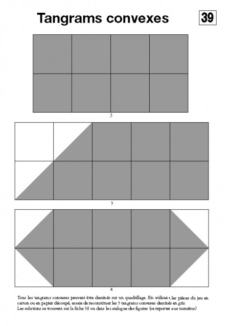 Cet ouvrage est accompagné d'un jeu en carton dont les pièces peuvent être détachées à la main. Une fois les 7 pièces enlevées, il reste un pochoir qui peut servir à dessiner les pièces avec précision sur une feuille de papier ou de carton. (Vous pouvez aussi vous procurer ces jeux en plus grande quantité). Ce jeu est à la base de l'utilisation de ce fichier. Bien que tous les exercices puissent être réalisés avec des pièces en papier découpé, l'usage des pièces cartonnées est bien plus confortable.