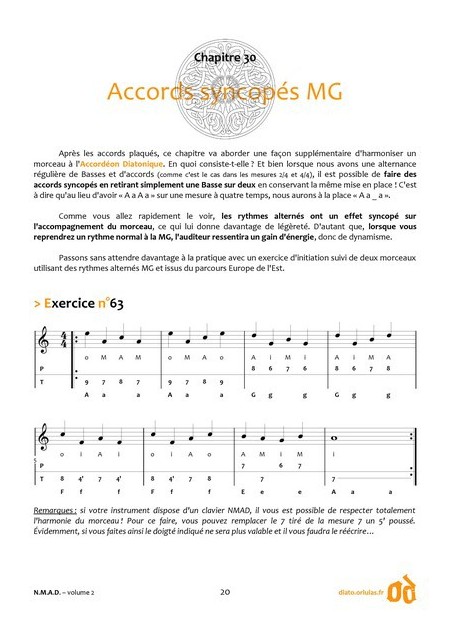 Rédigée pendant l'été 2014 et soigneusement peaufinée durant une année entière, cette Nouvelle Méthode d'apprentissage instrumentale pour Accordéon Diatonique (appelée N.M.A.D.) en Sol/Do avec 2rangées/8basses est la plus récente publiée à ce jour. Le premier volume de cette méthode propose aux débutants d'apprendre à jouer d'une manière innovante à travers une amélioration du schéma de clavier standard européen et par la prise en compte de plusieurs notions jusqu'alors réservées aux Accordéons Chromatiques : articulation des doigts, phrasé, respirations, nuances et logique de doigtés à cinq doigts main droite seront notamment abordés dans ce livret !